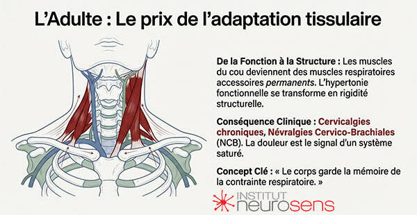 Chez l’adulte, lorsque ces adaptations se prolongent pendant des années, le système finit par “payer le prix” sur le plan biomécanique. Les muscles cervicaux et scapulaires deviennent des muscles respiratoires accessoires de substitution. Le tonus de fond ne redescend plus. La posture se rigidifie. Apparaissent alors les cervicalgies, les névralgies cervico-brachiales, les douleurs chroniques dites “mécaniques”, souvent résistantes aux traitements locaux.