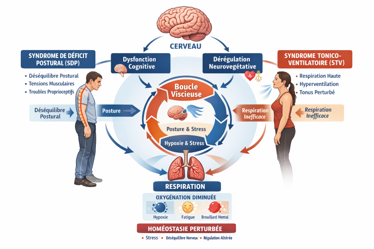 Le Syndrome de Déficit Postural (SDP) et le Syndrome Tonico-Ventilatoire (STV) sont des concepts issus de modèles fonctionnels visant à expliquer certaines interactions entre posture, respiration et régulation neurovégétative.